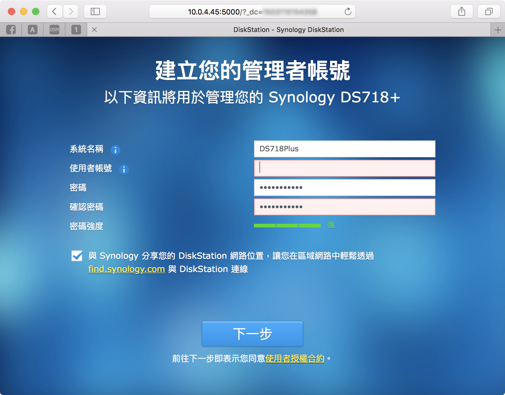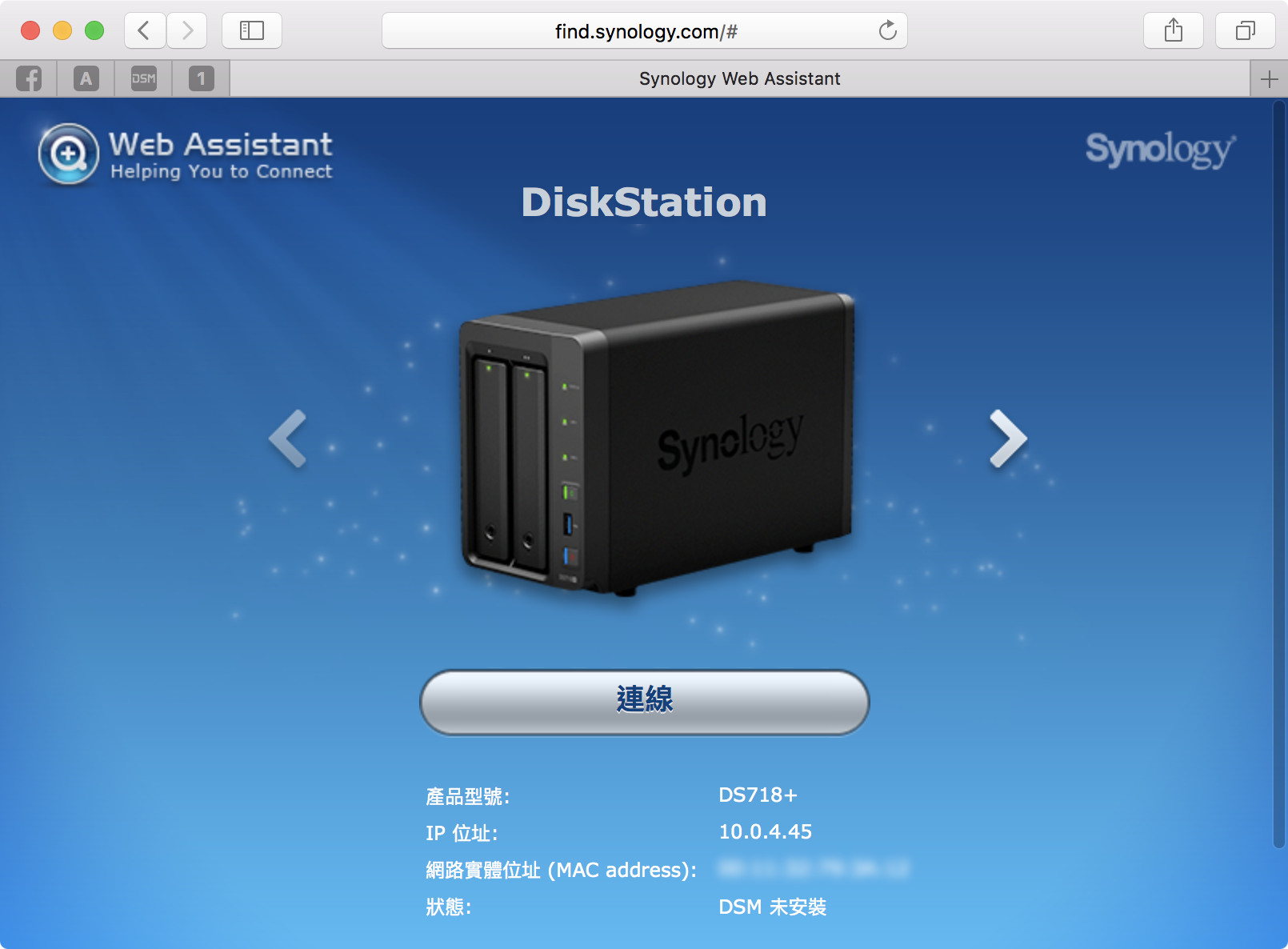 ▼ 初始設定很簡單,只要把 DS718+ 插上網路線連接到 Router,然後插上電源開機即可。這時候只要 Mac 有在同一個網域內,無論是有線或無線網路,都可以打開 Safari 輸入網址 find.synology.com 就可以找到了,超級神奇。