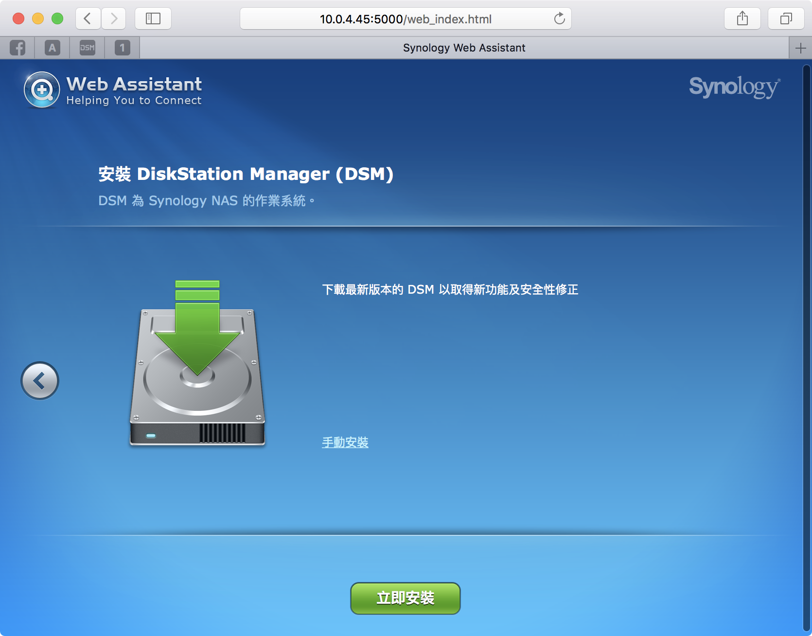 ▼ 連線之後我們還不能直接使用喔,我們要先幫他安裝 DSM 系統,也就是專為 Synology NAS 設計的作業系統。現在的 NAS 廠牌都已經不是單純的無線硬碟了,都會有很多的功能可以用,所以各家都會有各自的系統要安裝,而系統好不好用,就影響了最直接的第一印象。而這方面,我對 Synology 的印象是無可挑剔的。