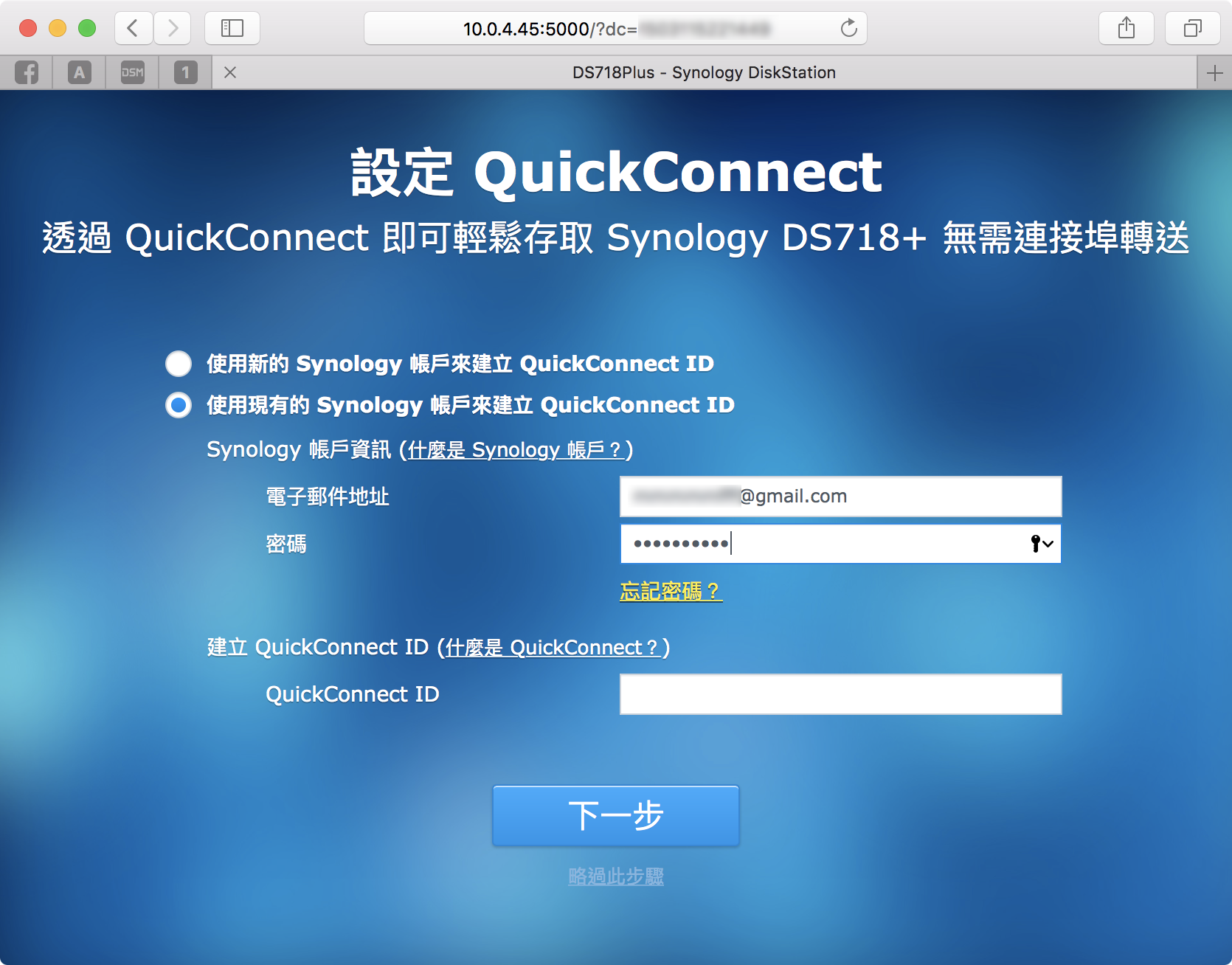 ▼ 接下來設定 QuickConnect 帳號,以前很多人對 NAS 的印象就是只能在區域網路內使用。但現在不但可以從外面連回家中,而且透過 QuickConnect,這個動作變得非常簡單,就只是按下網址然後輸入帳號密碼就好,就算是從國外也可以簡單連回家中拿檔案。