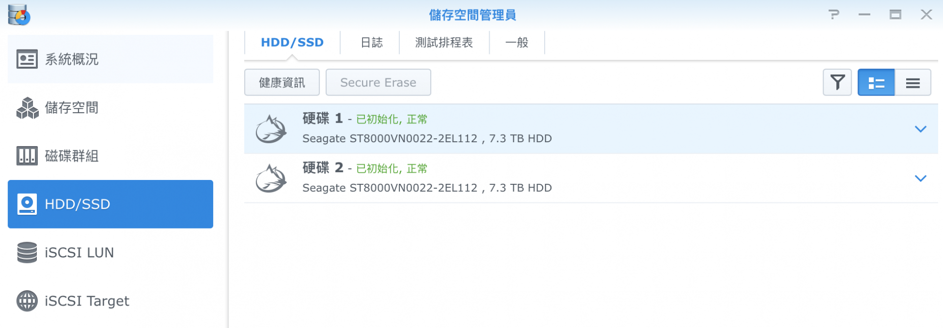 ▼ 這次使用的硬碟是 Seagate 的 Ironwolf 系列的 8TB 硬碟兩顆。基本上我現在已經很習慣 NAS 上使用 Ironwolf 系列,因為除了速度讓我很滿意之外,最重要的是他有 Ironwolf 健康管理系統,看的到硬碟的狀況安心度就提昇很多。