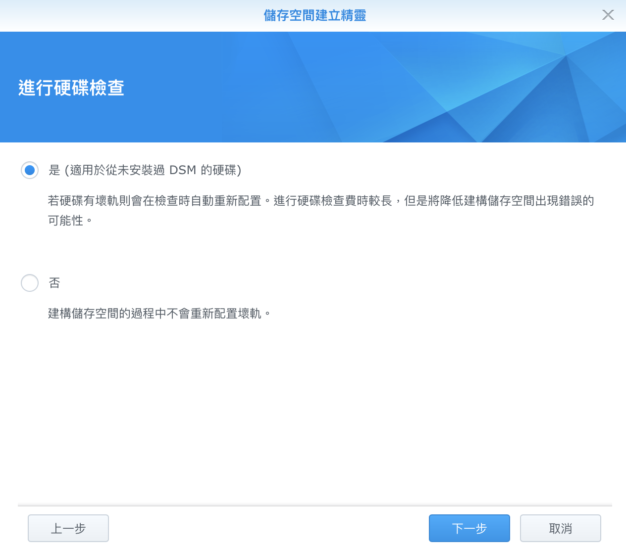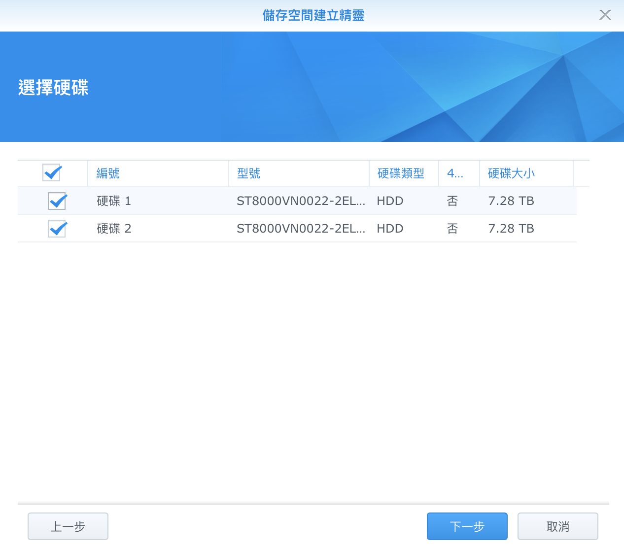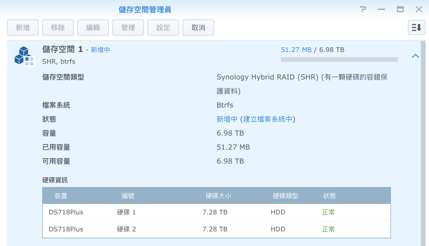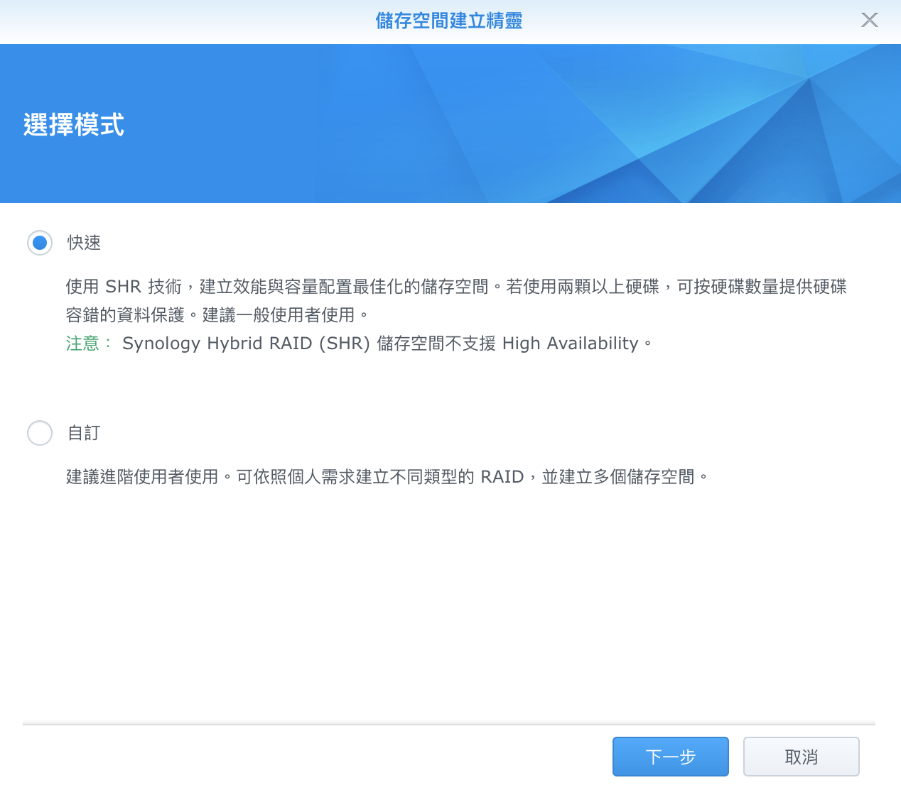 ▼ 這裡你可以選擇 SHR 模式,也就是 Synology 的自動化磁碟陣列(RAID) 管理系統,他會把兩顆當做一顆使用,所有的資料都會自動存成兩份,不追求容量或是速度,以安全為主軸。