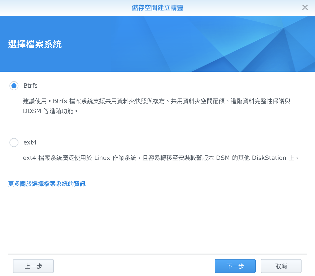 ▼ 在選擇硬碟格式的時候,就可以選擇 Btrfs 格式,為什麼要選擇這格式呢?因為此格式之後才可以開啟快照功能,保護你的資料免於勒索病毒侵害。