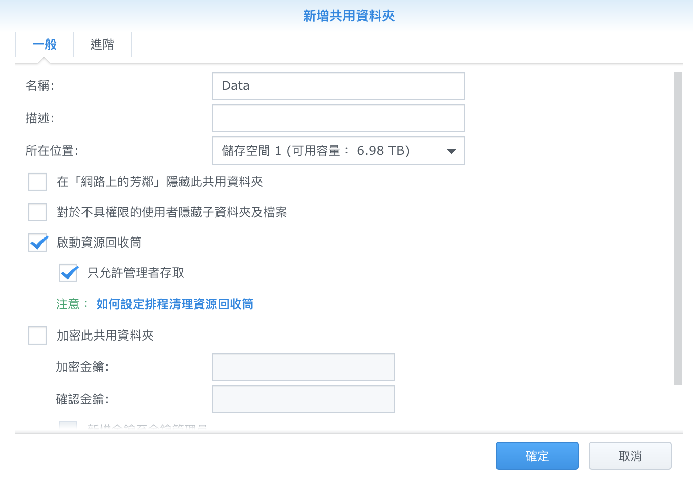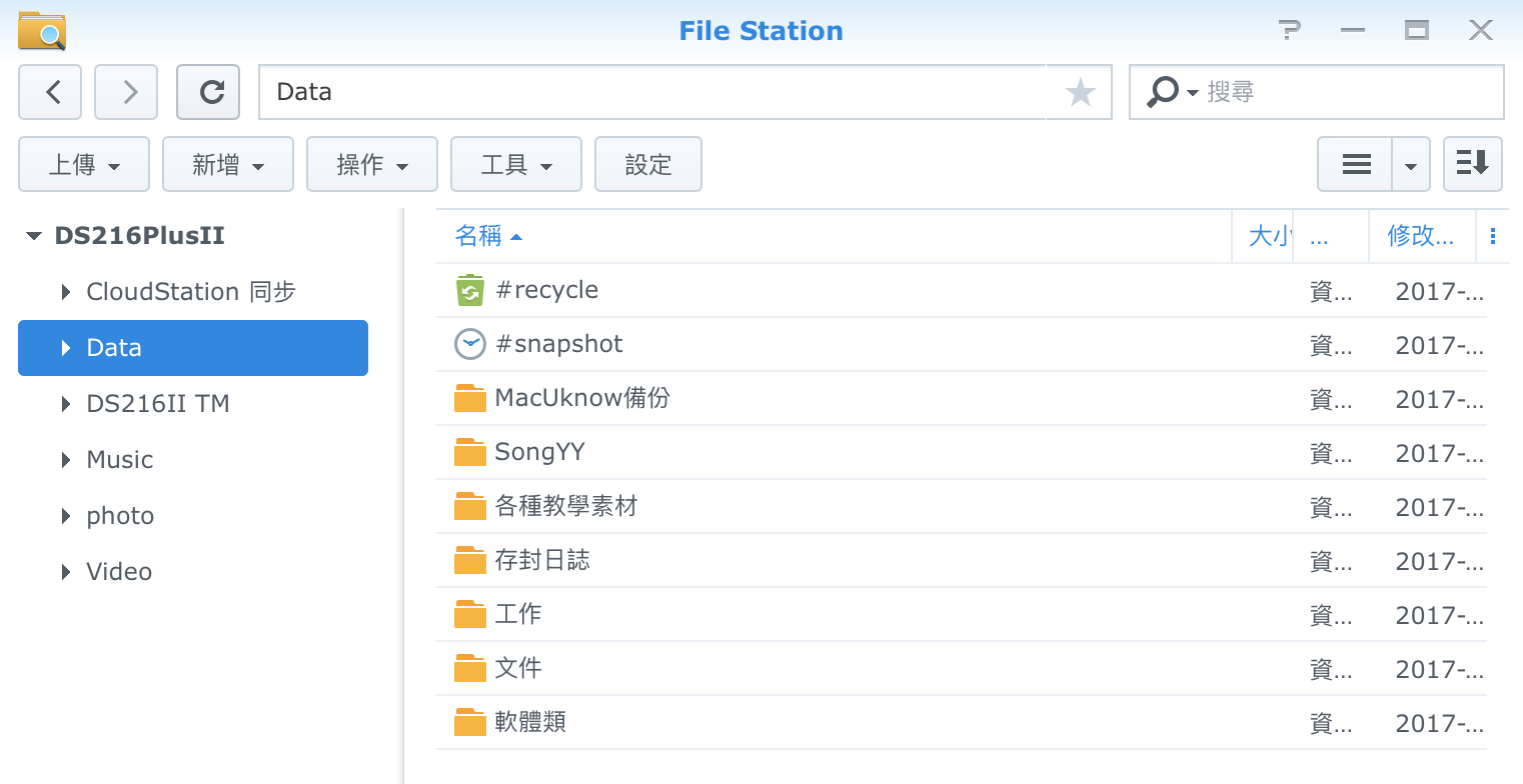 ▼ 初始的資料夾的位置在根目錄,在 DSM 中叫做共用資料夾,我們可以先建立一些常用到的分類,比如說「影片」、「工作」、「照片」之類的。比如示範中我建立一個「data」的資料夾。