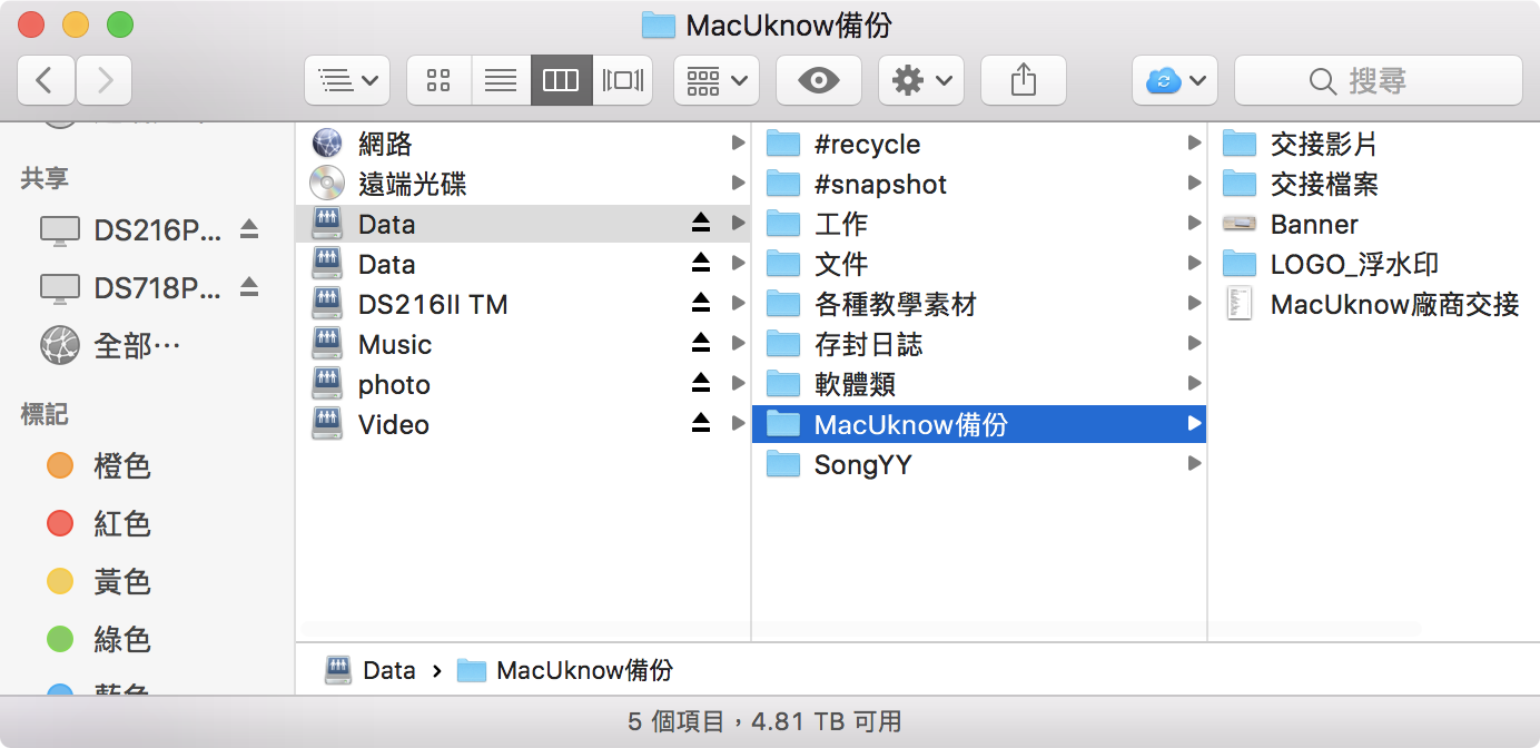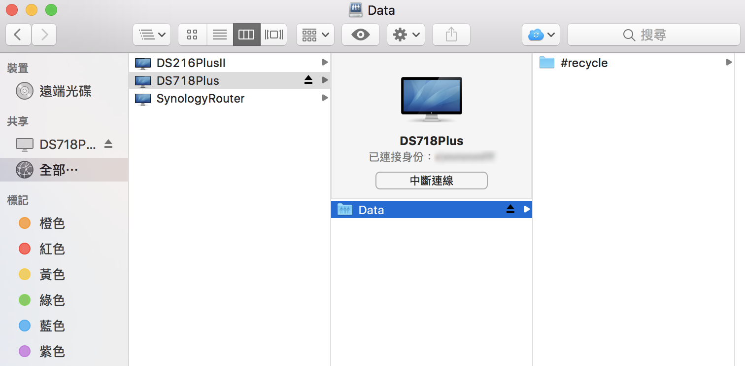 ▼ 現在我在 Mac 上的 Finder 左邊的共享,就可以看到我剛剛架設好的 DS718+囉,只要點選之後輸入帳號密碼,就可以看到 data 這個資料夾,並且把資料放進去了。
