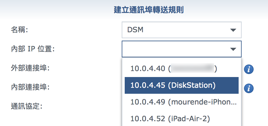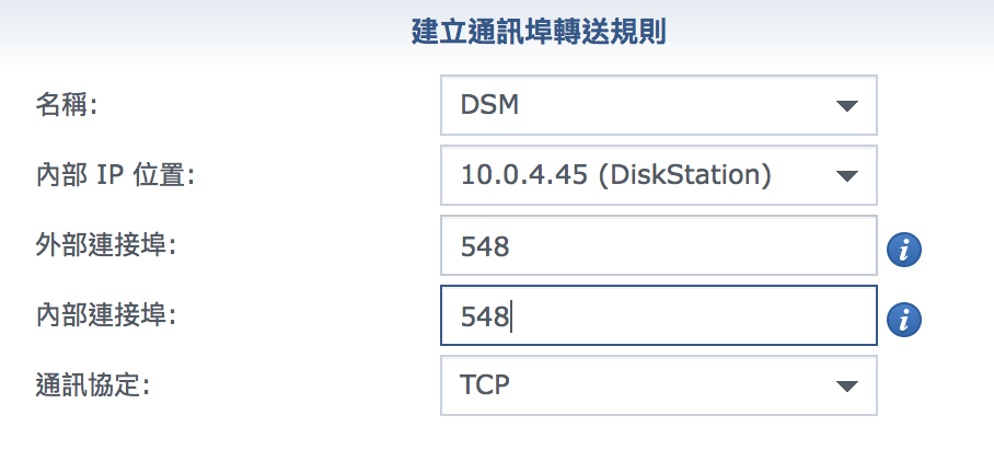 ▼ 不過下方的 TCP 這些要怎麼填呢?每台 NAS 的設定可能多少會有點不同,以 Synology 來說,他們官網有詳細的資訊,我就可以知道我要的功能要填上哪一個。比如我現在要用的網路磁碟是 afp,所以是選擇 TCP 然後填入 548。