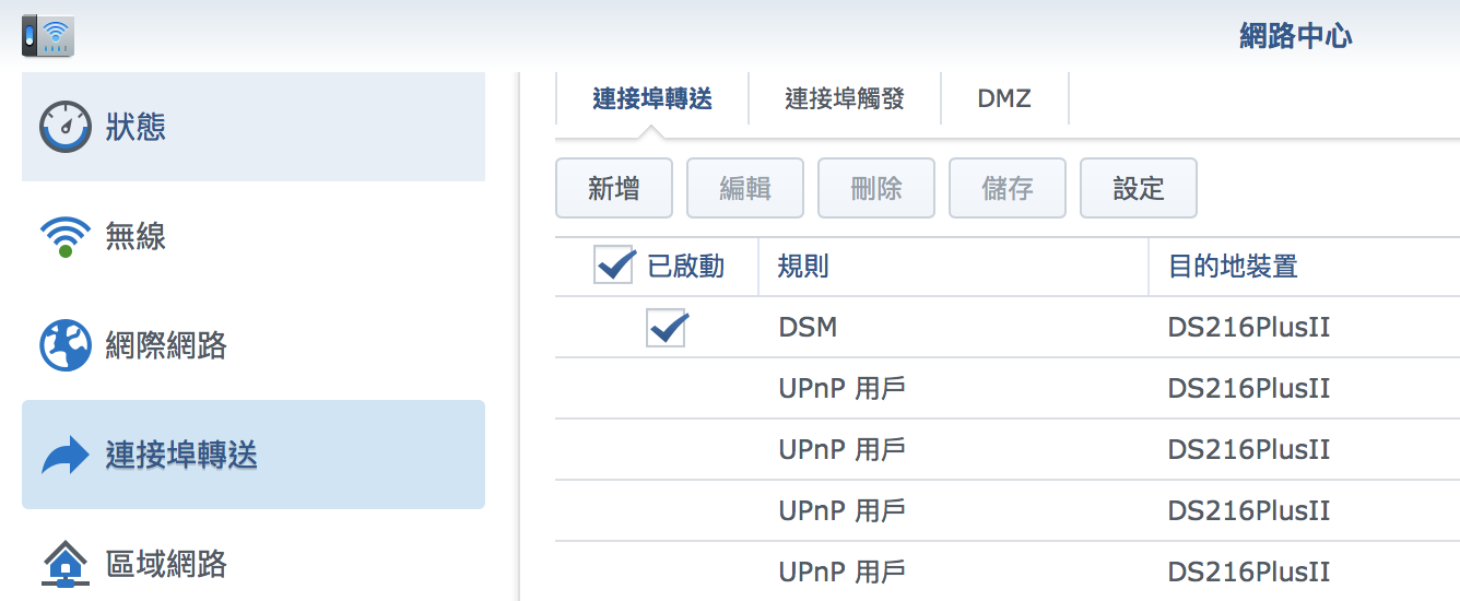 ▼ 進入網路中心選擇新增一個連接埠轉送設定,可以看到目前我已經設定好了我原本的舊機種 DS216+II,現在我要設定 DS718+。