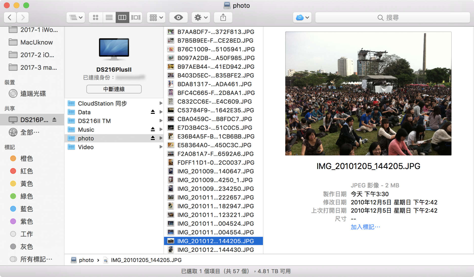 ▼ 現在就算人在外頭,也可以用 Finder 連回家中 NAS,如果只是要單純存取檔案的話,比用網頁少一層指令,不但直覺,而且速度也比較快一點。