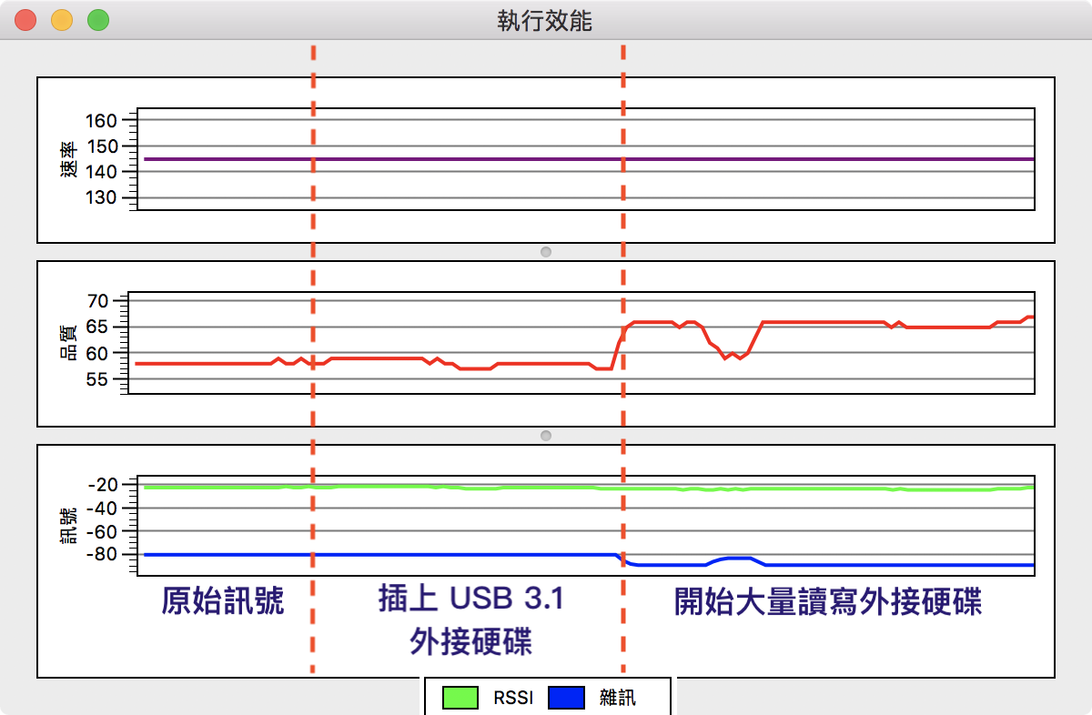 速率及 RSSI 的部份從頭到尾都沒有變化,維持一樣的水準,連線品質只有在大量讀寫外接硬碟時才有波動,不過也在 10% 內,算是誤差值內。