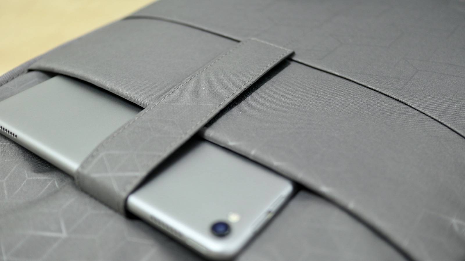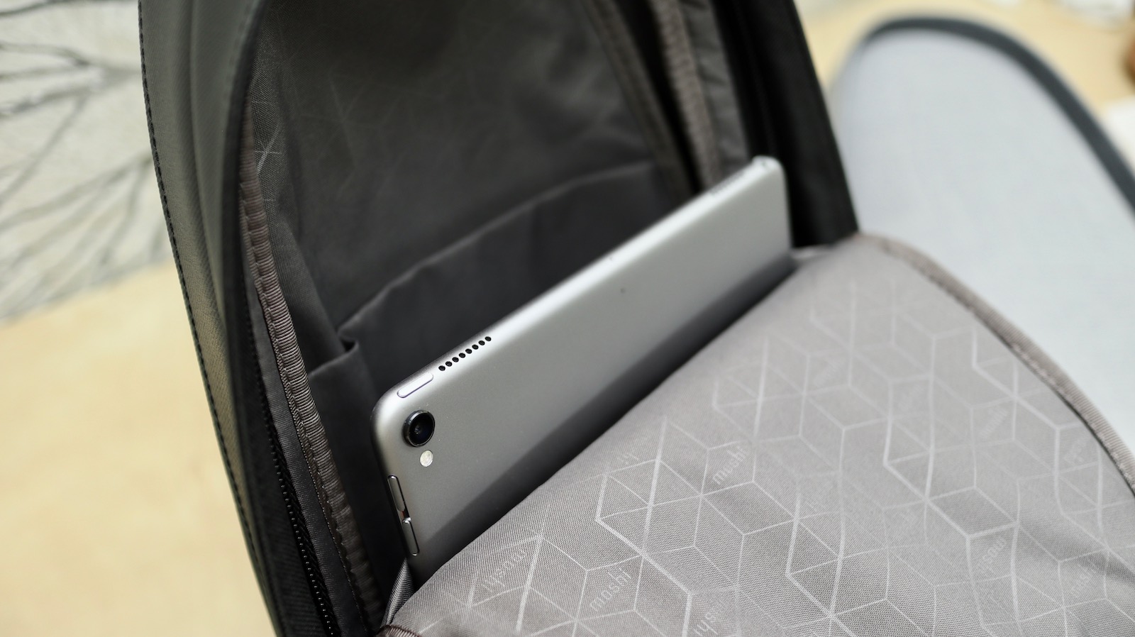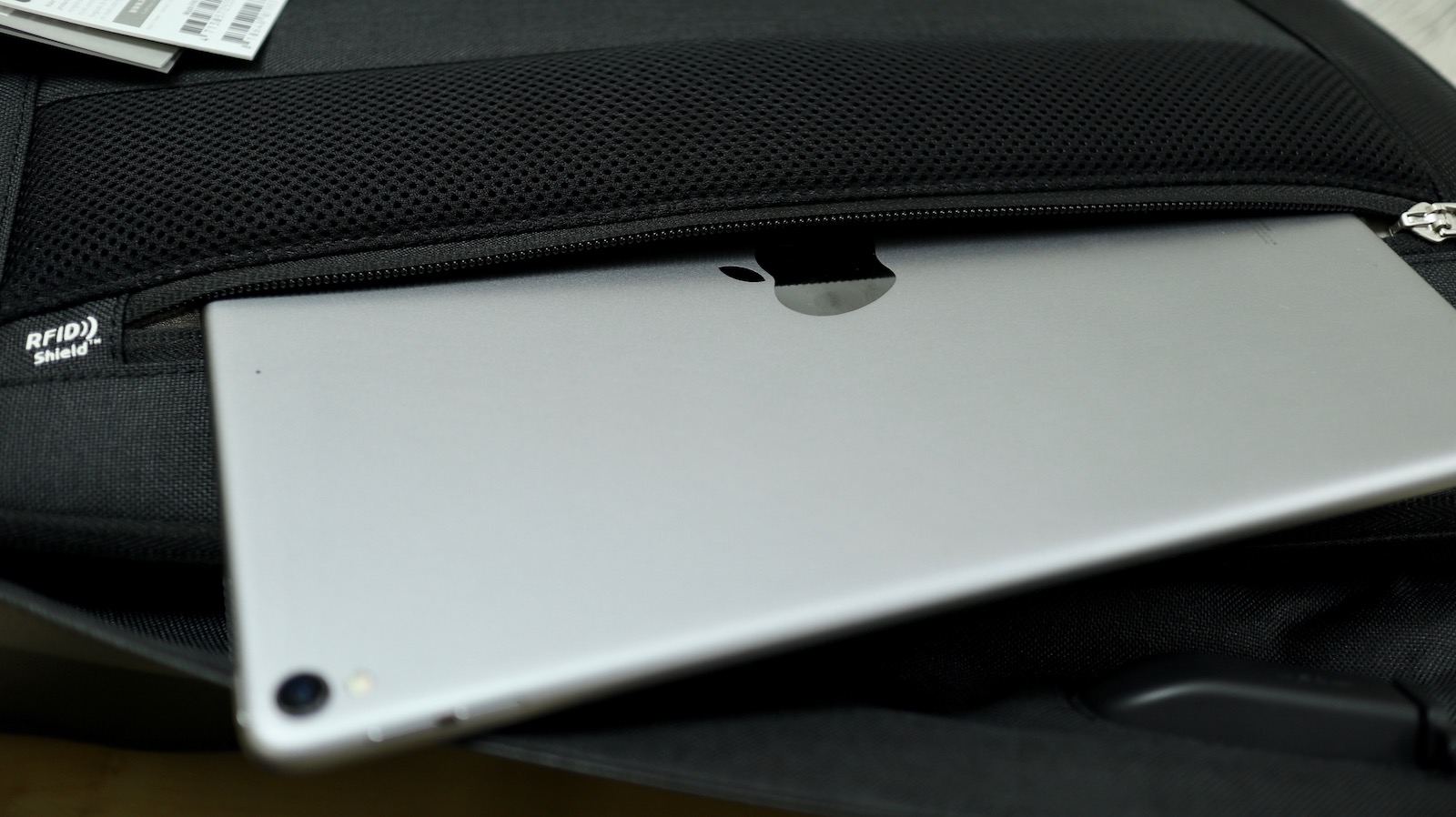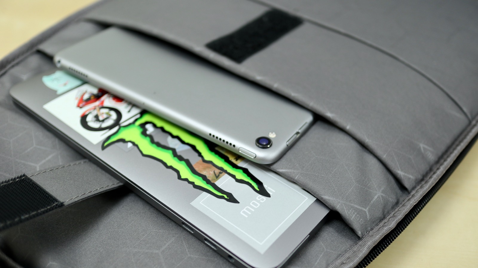 ▼ 既然我把它當電腦包,自然是有電腦收納空間,攤開的那一面,有幾個夾層可以放 3C 產品。比如說中間的那層可以放下 iPad。我放的是 10.5 吋的 iPad Pro,看起來裝 12.9 吋的也沒問題。