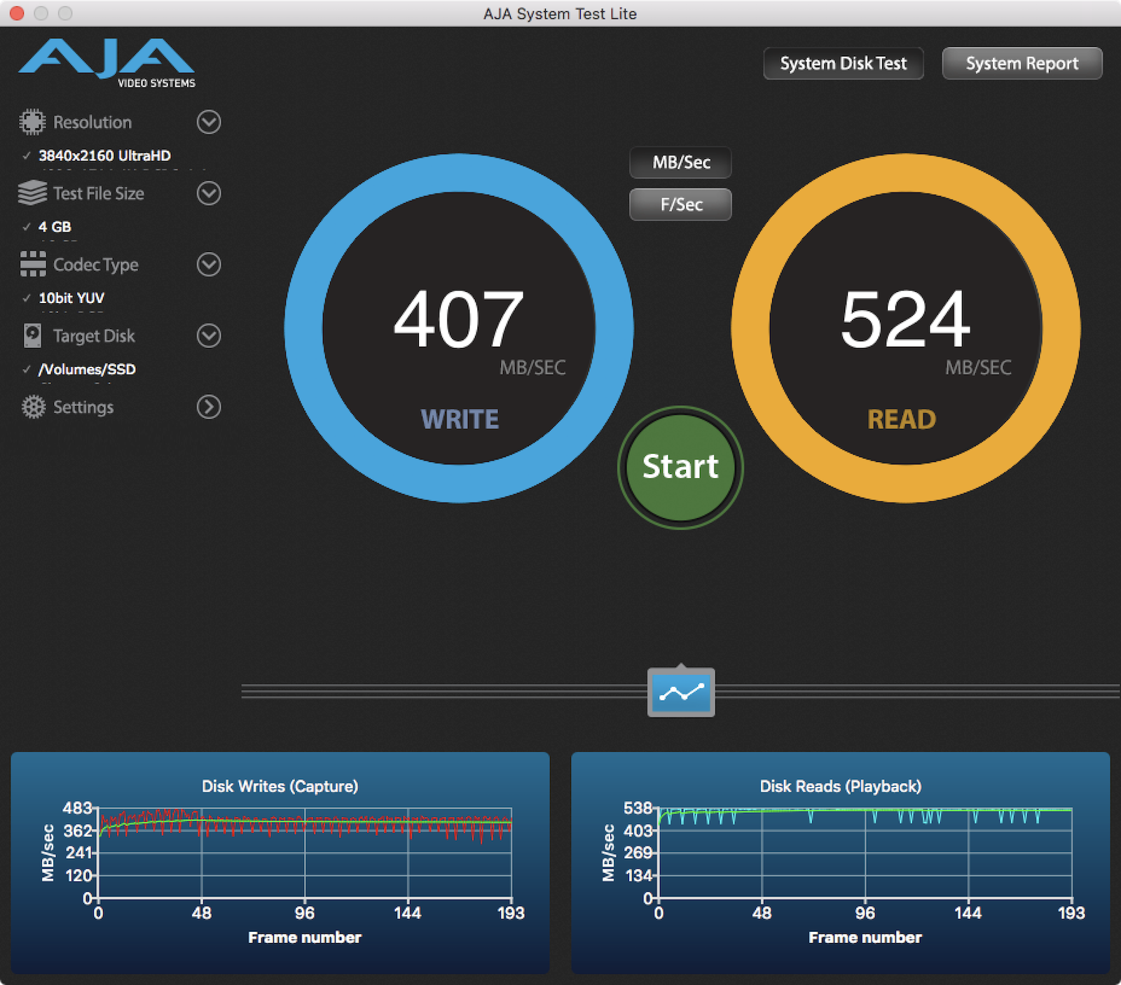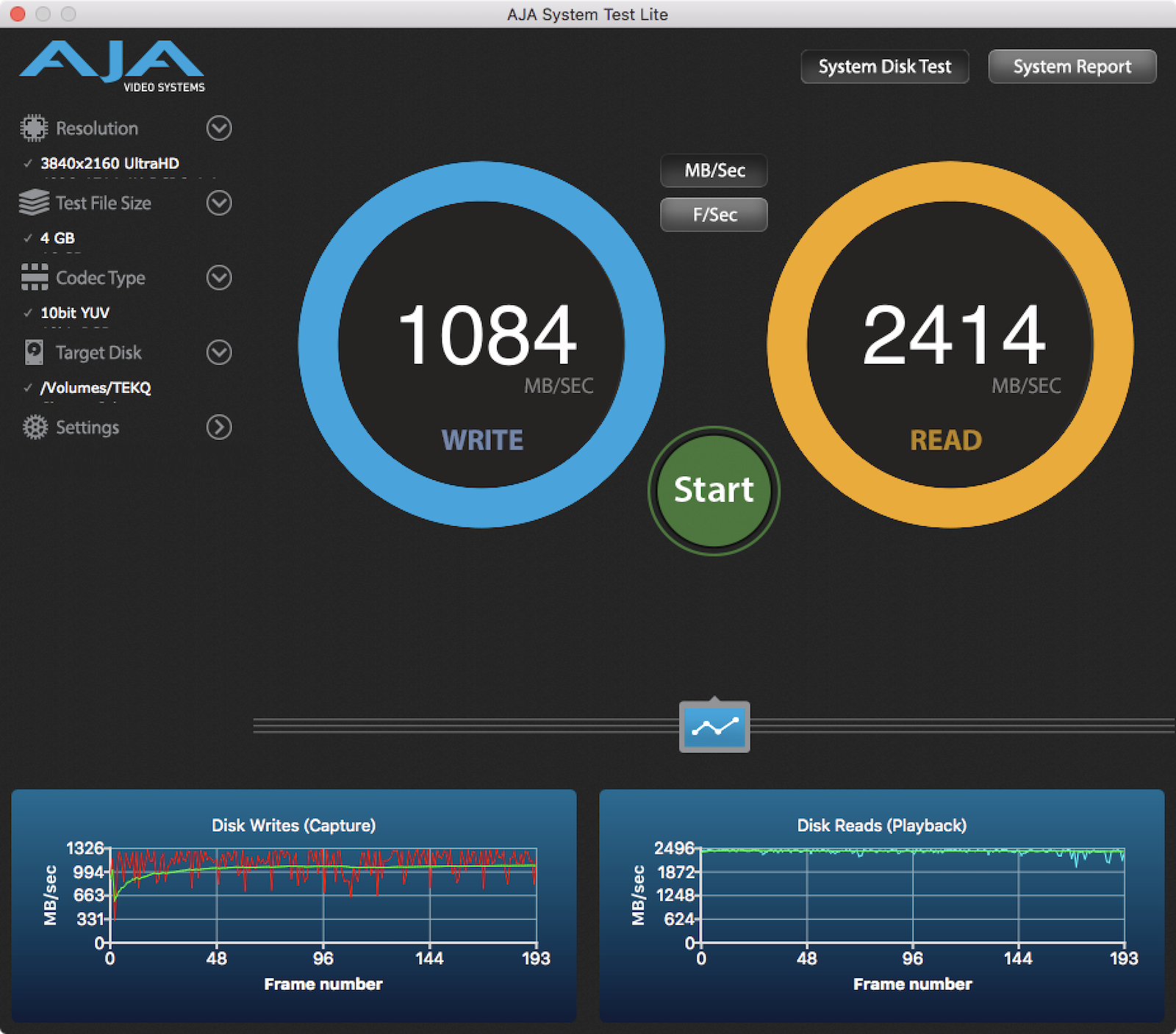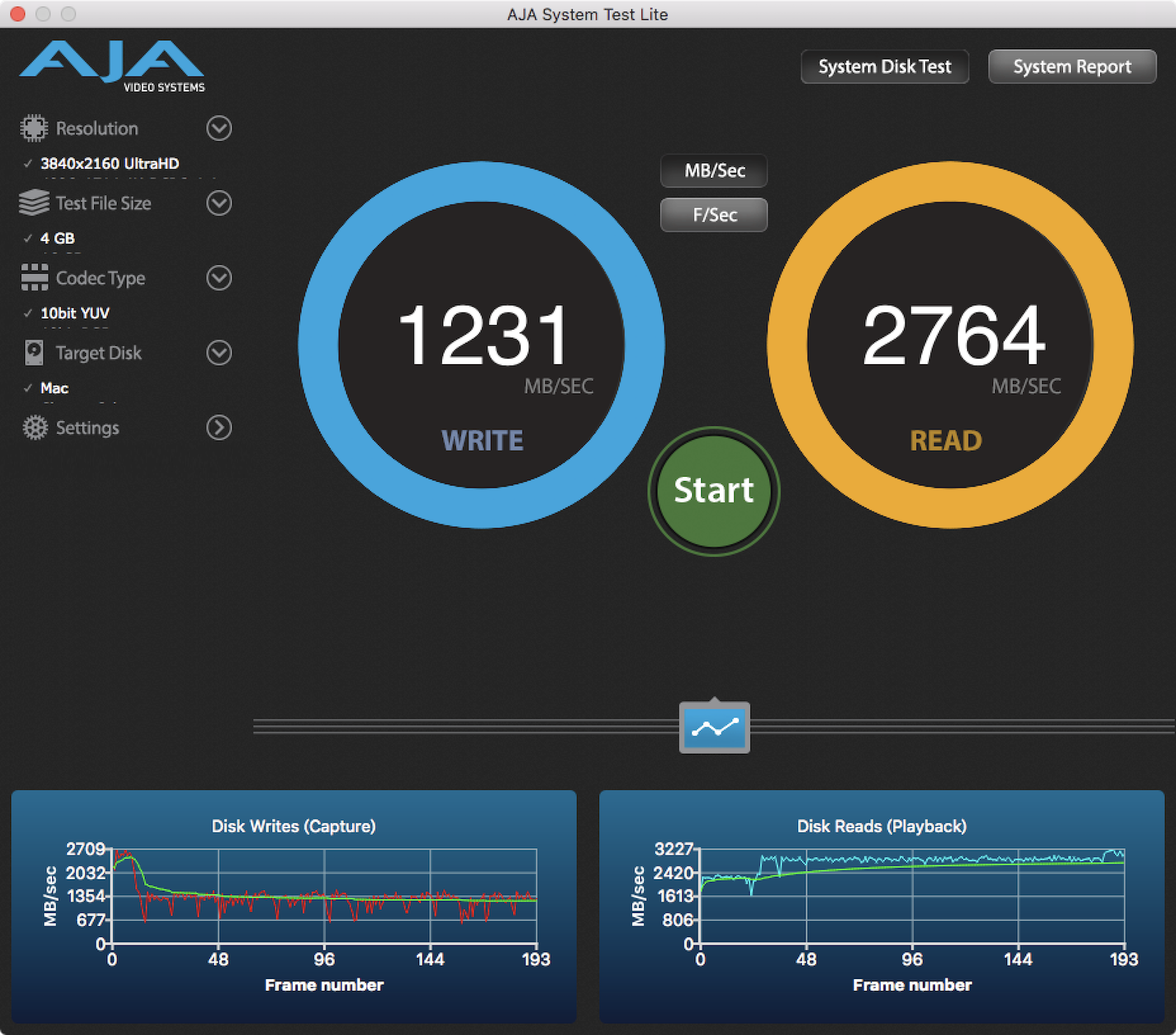 ▼ 首先我們先來看看 Mac 內建的速度,由於用不同的編碼或是不同的格式,測出來的速度會有點不同。所以我們找到了可以測到最高速的條件之後, Mac 內建的寫讀速度約為 1200MB/s、2700MB/s。不管什麼時候看都覺得這是驚人的快。