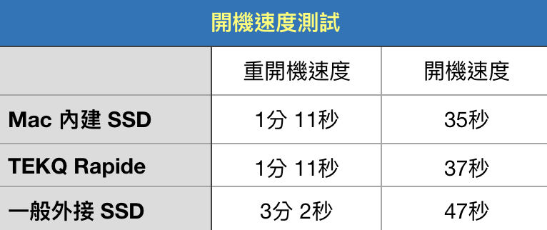 接著我們來測試開機速度,對於 Windows 來說,有些版本是不支援使用 NVMe 作為開機碟的,但我們 Mac User 沒這困擾,一樣可以做成開機碟,使用外接 SSD 來開機。