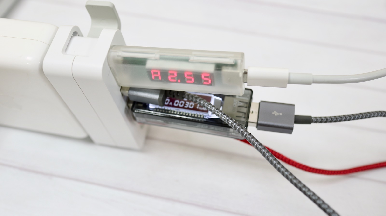 ▼ 在沒有用轉接頭的狀況下,電壓 20V 的情況下測到的電流為 2.6~2.8 上下,扣掉損耗,算是符合 61W 。