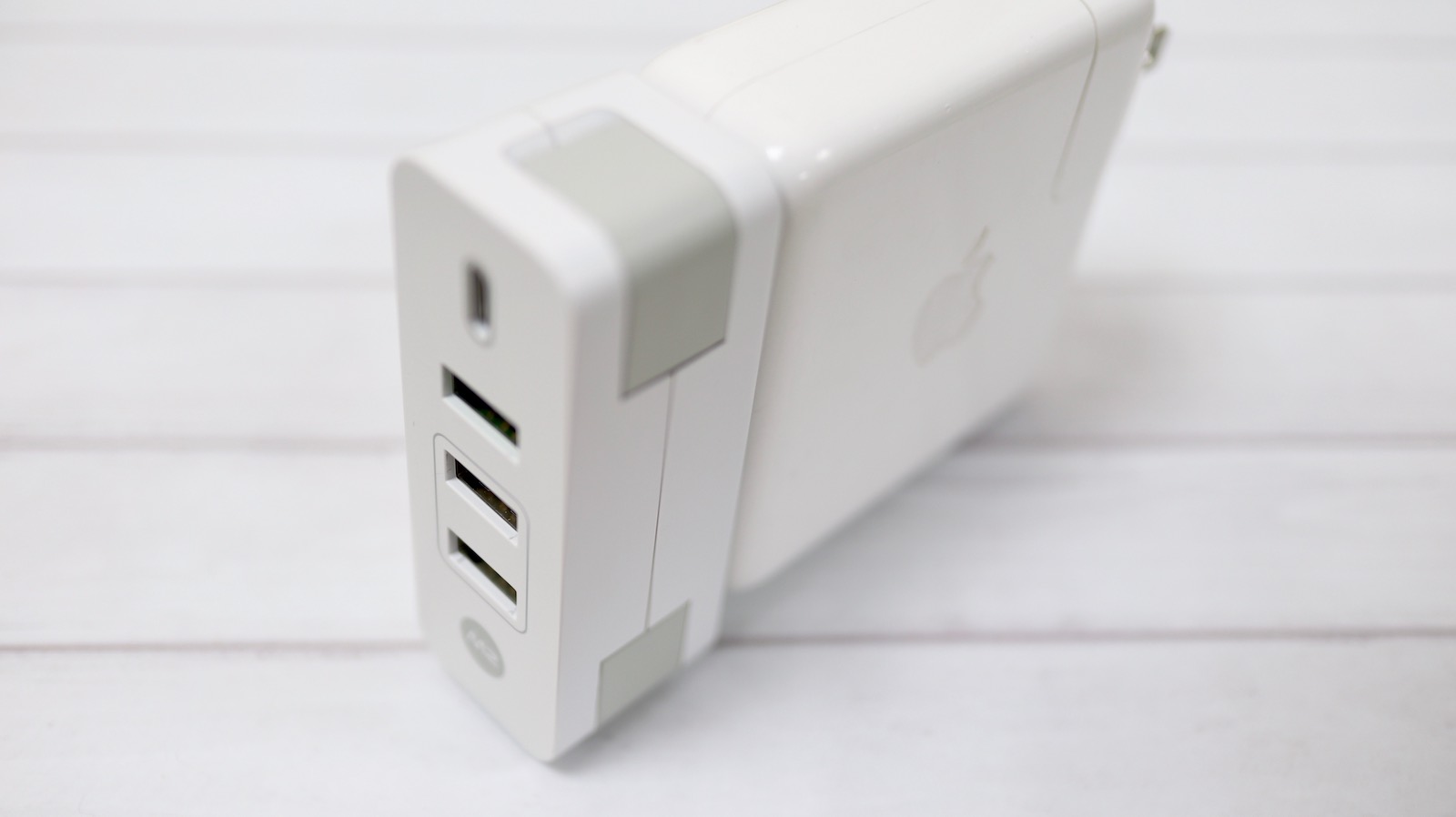 ▼ 簡單來說他就是一個一轉四的轉接頭,跟一般 USB-C 轉接頭不同的是,他並不是插在電腦那一端,而是插在電源供應器的上方。把原本只有一孔輸出的電源供應器,分成四孔輸出。