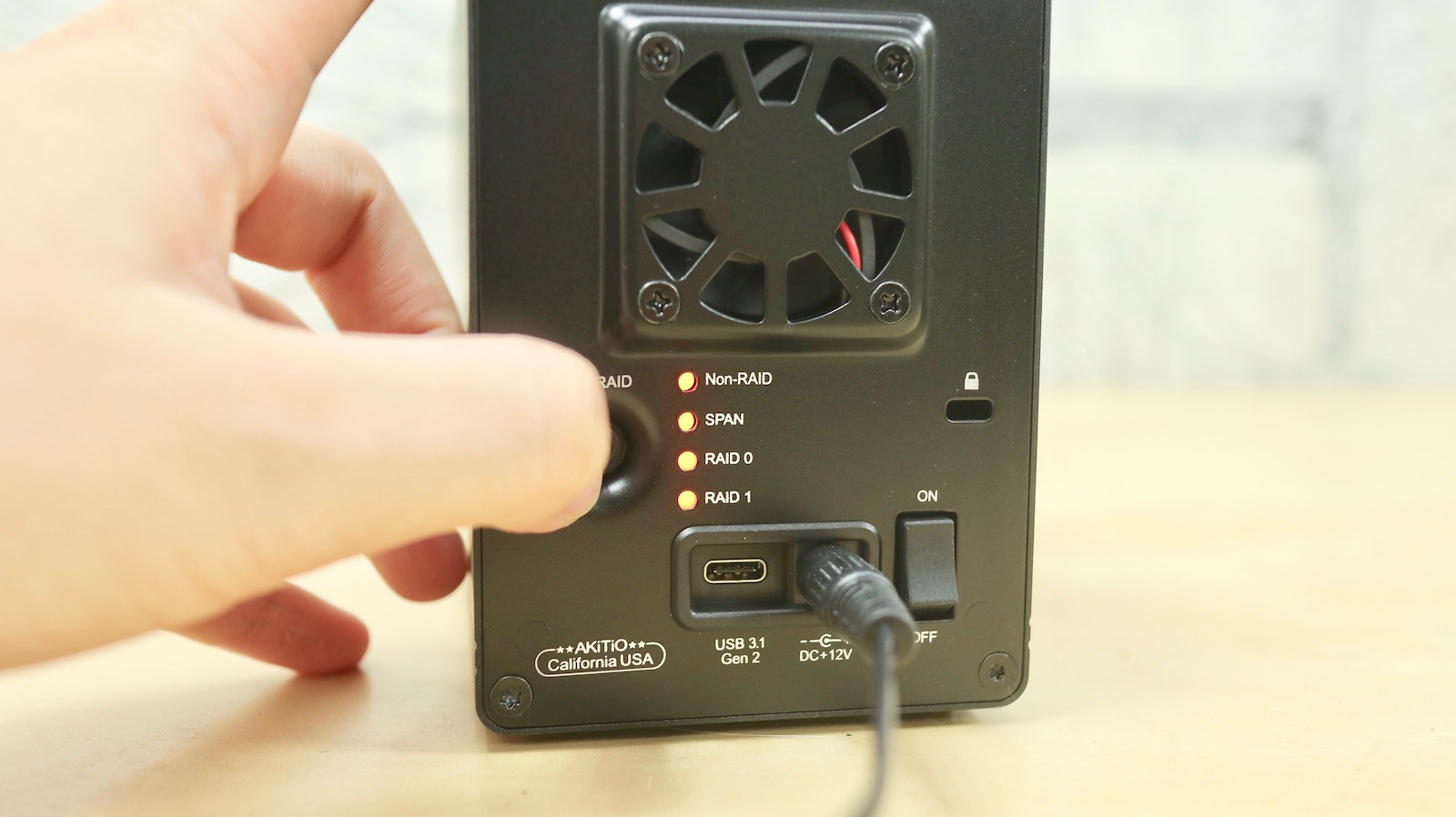 ▼ 插電之後,先別急著插上電腦使用,我們要先設定好 RAID 模式,先按住 RAID 鈕五秒,直到四個燈全亮,就可以進入設定模式。