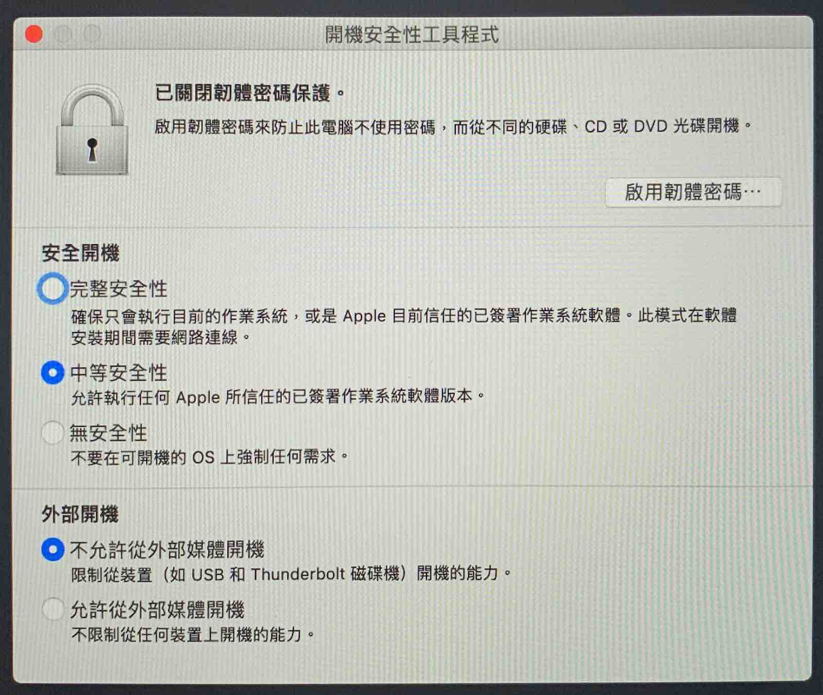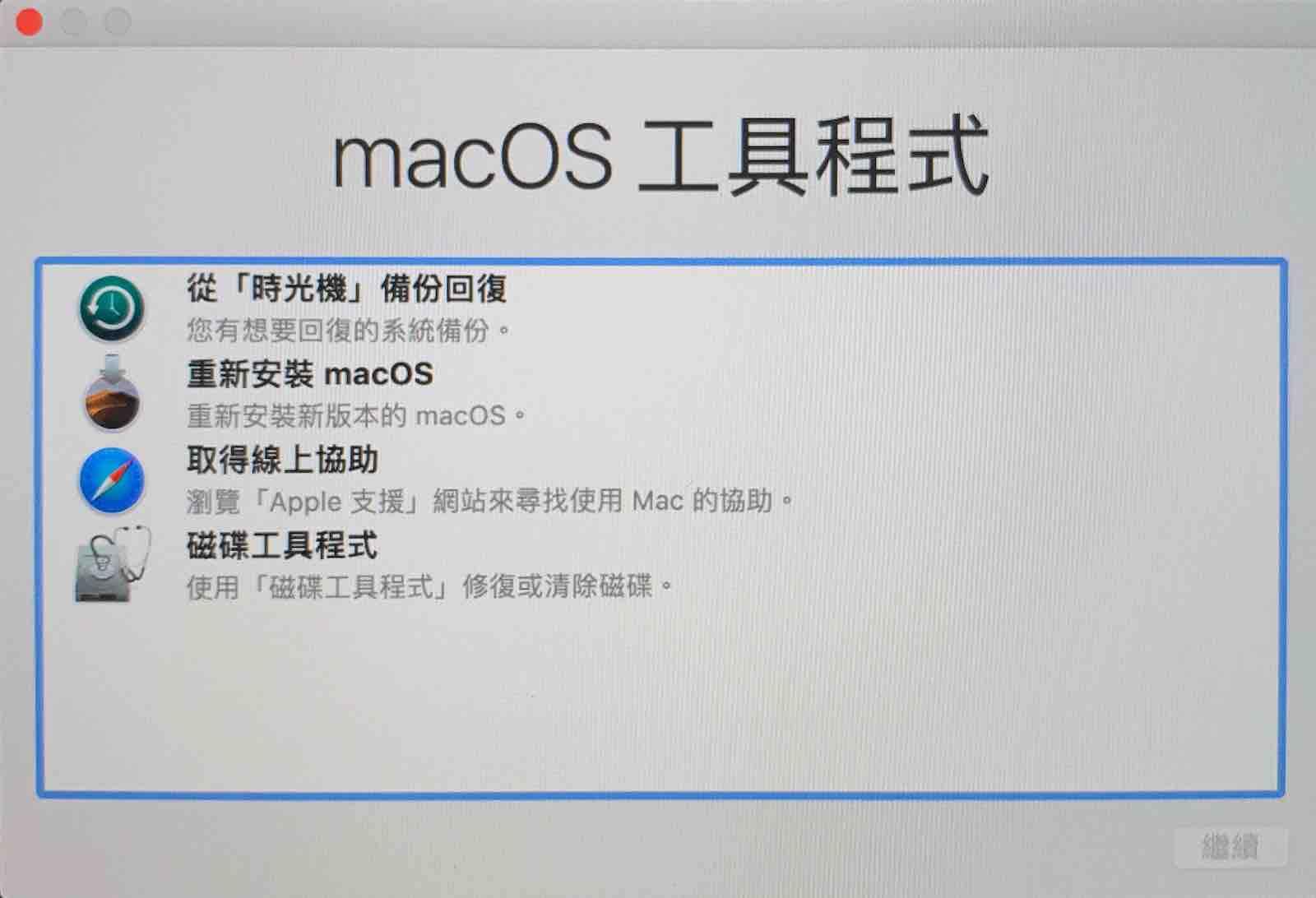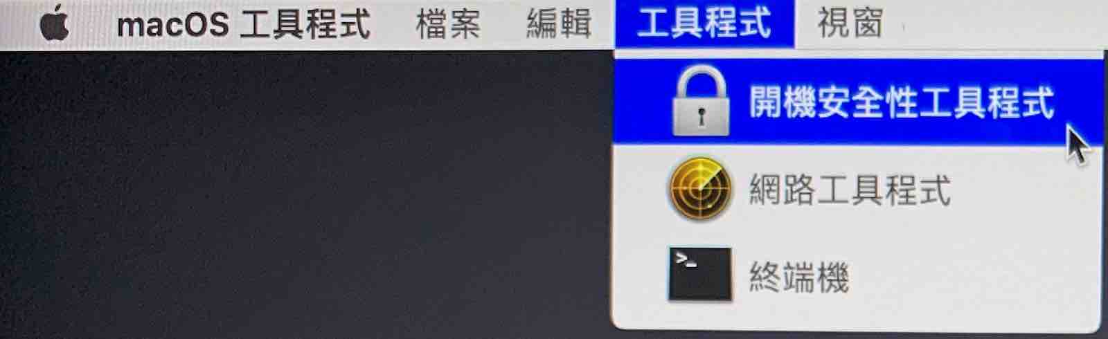 ▼ 不過從有 T2 晶片的 Mac 開始,對於系統安全性有著進一步的提升。現在新的 Mac 預設是不能用外接系統開機,當然也就包含了我們剛剛製作的重灌用隨身碟。所以這時候我們要先關機,按住 Command+R 開機進入恢復模式,然後在上方的工具程式選擇「開機安全性工具程式」。