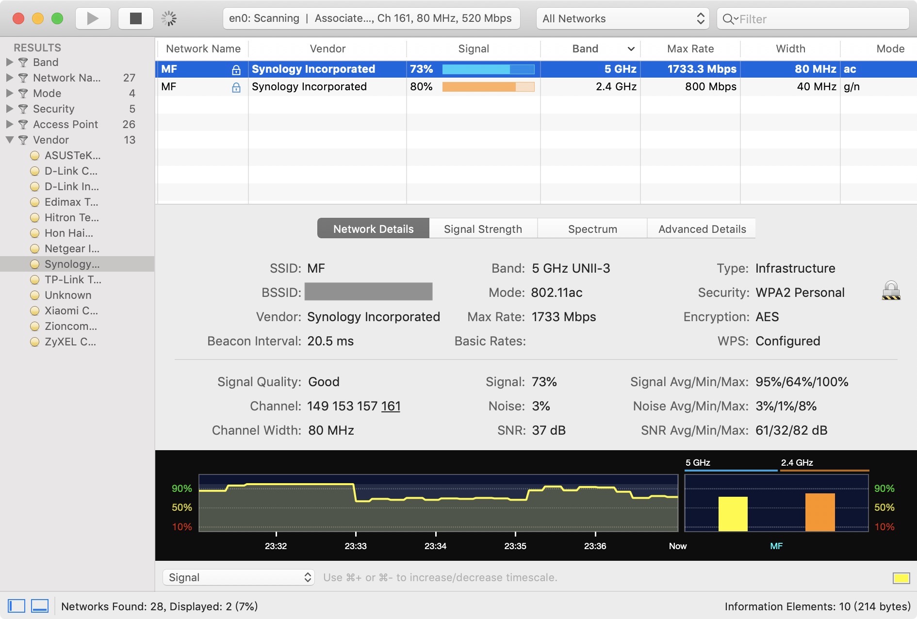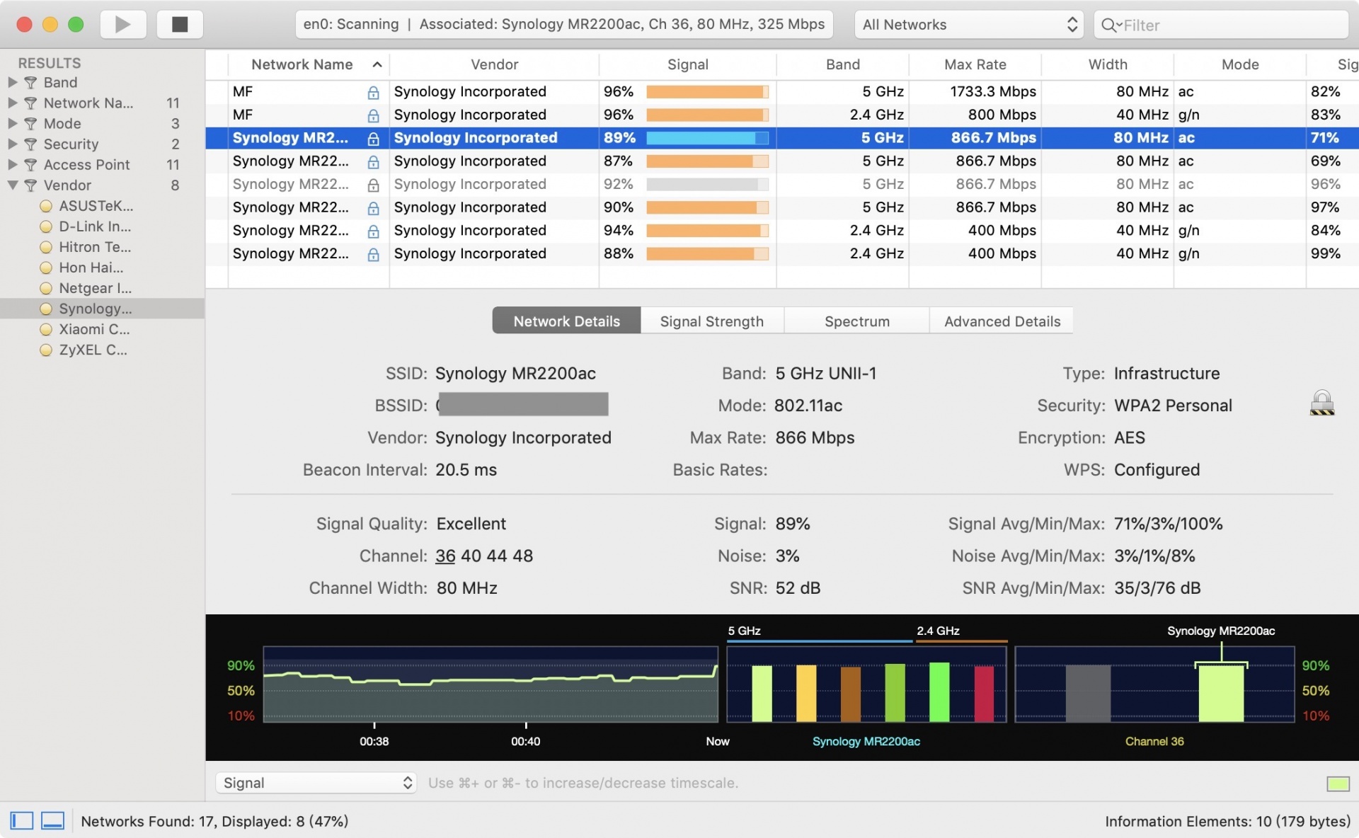 ▼ 而這時雖然一般裝置收尋 WiFi 還是只會看到一個 SSID(WiFi 名稱)但其實這已經是由多個裝置所組成的大範圍 WiFi,透過 WiFi Explorer 就可以看到實際上這是由多個頻段組合而成的。