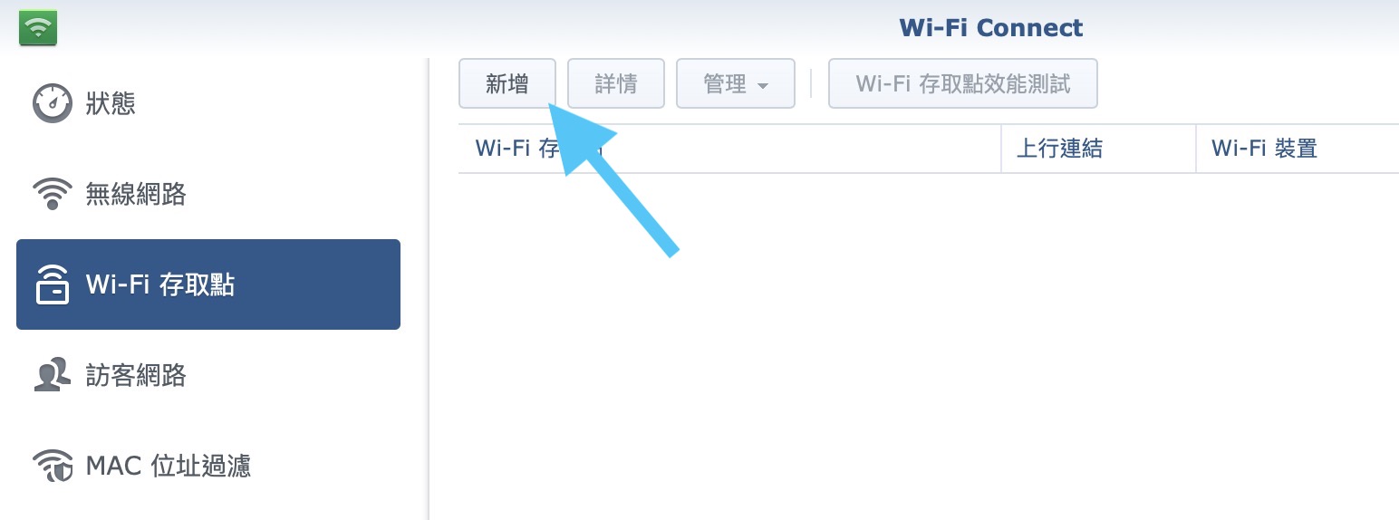 ▼ 單一機器比較結束之後,我們要來搭建 Mesh WiFi 了,一台機器無法跨兩層樓,那我們用兩台來接力呢?打開 SRM 中的 WiFi connect 之中的 WiFi 存取點,然後按下新增。