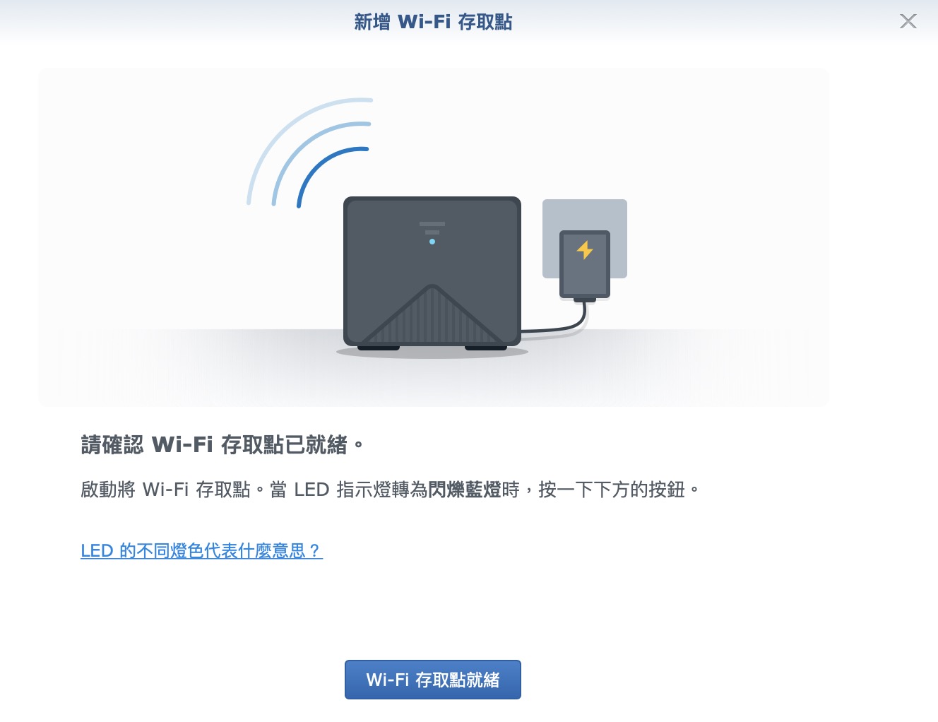 ▼ 放好位置之後,插上電源開機,但我們不用去登入第二台的什麼管理介面,我們繼續在第一台設定就好。按下「 WiFi 存取點就緒」
