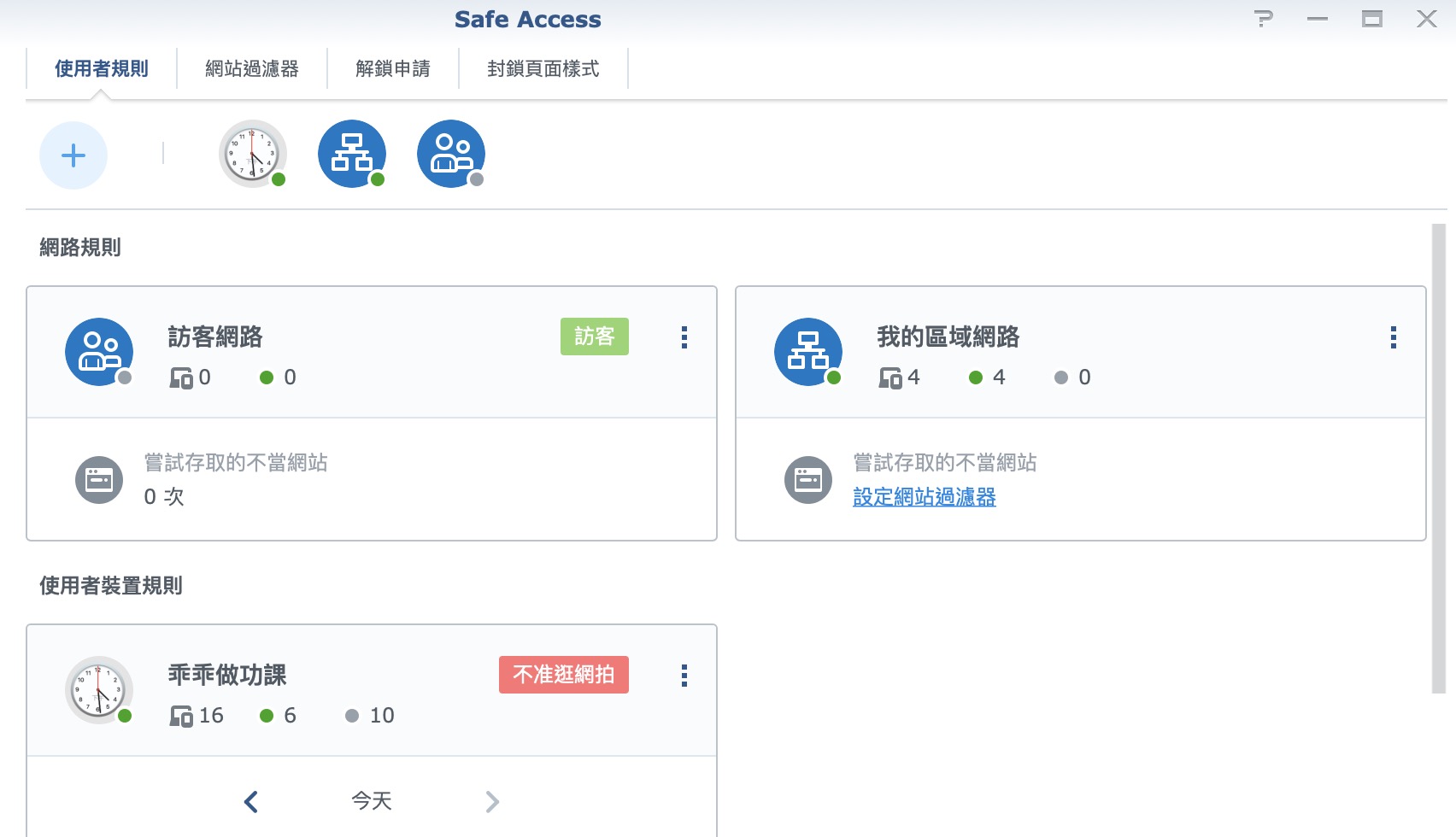 雖然以前 SRM 也可以封鎖一些網址,不過無法分群組來設定,當家庭成員各自有許多上網裝置的時候,就會顯得有點麻煩,而這次除了時間跟防止惡意網站,更加入了群組功能。