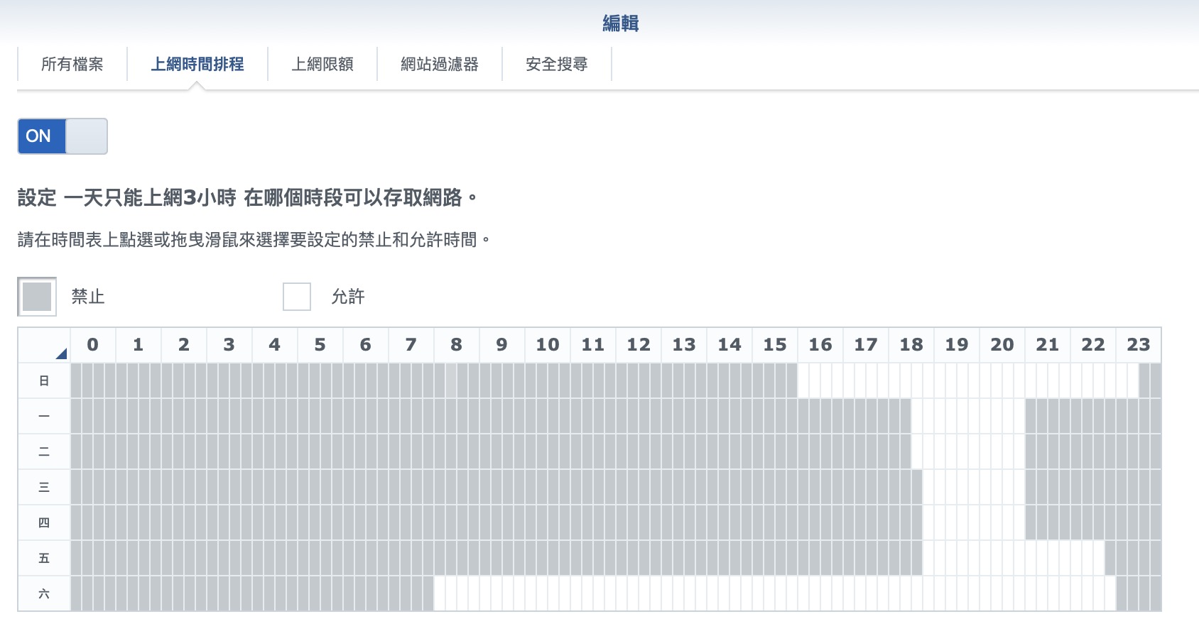 ▼ 另一種是直接規定允許的時間,當然兩種規則可以一起使用,比如說我讓他週六上網三小時,但開放早上下午都可以讓他自己選擇要哪些時間上網。