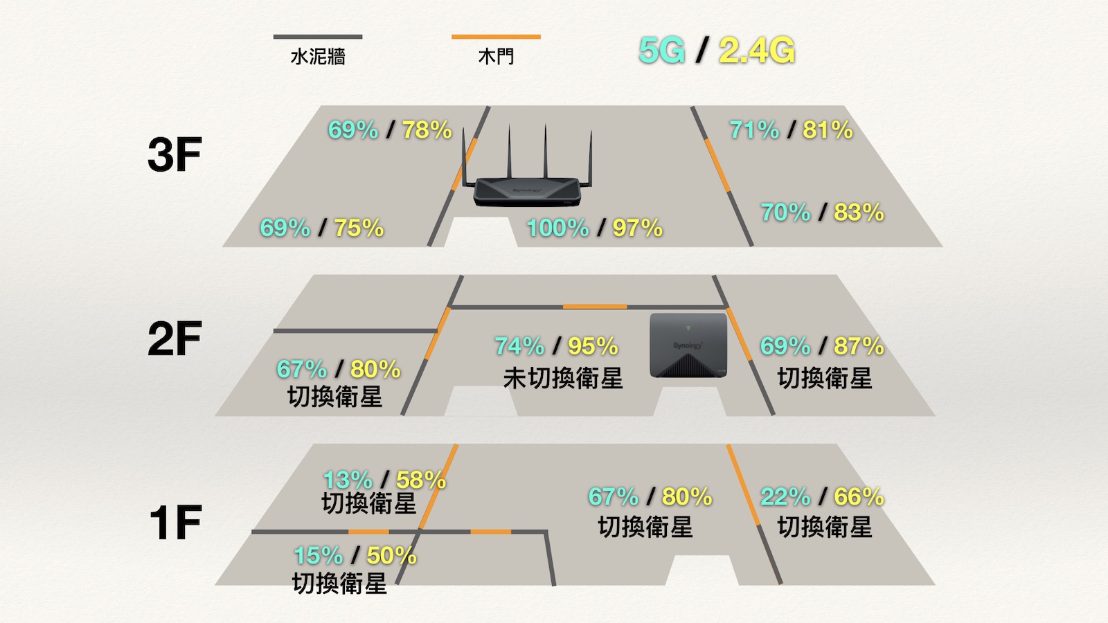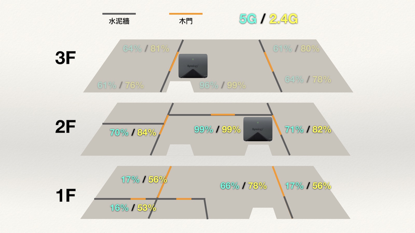▼ 實際結果如下,三樓基本上沒有變動,但二樓的訊號可以說是全面提昇,一樓也全面被 2.4G 完整覆蓋,甚至一樓中間 5G 也有不錯的表現。