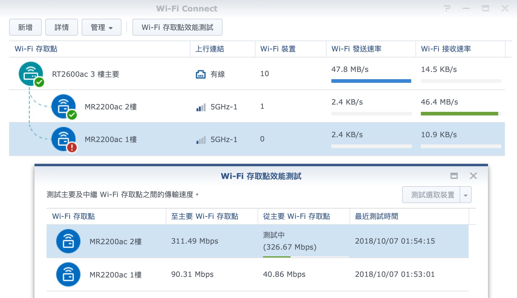 ▼ 但不知道是不是 RT2600ac 的訊號太猛,一樓的 MR2200ac 還在吃三樓 RT2200ac 的訊號,無法手動切換讓他接力2樓的訊號。因此可以看出一樓的訊號速度降級很大。除非把一樓的 MR2200ac 再放的遠一點,才會主要吃二樓訊號。