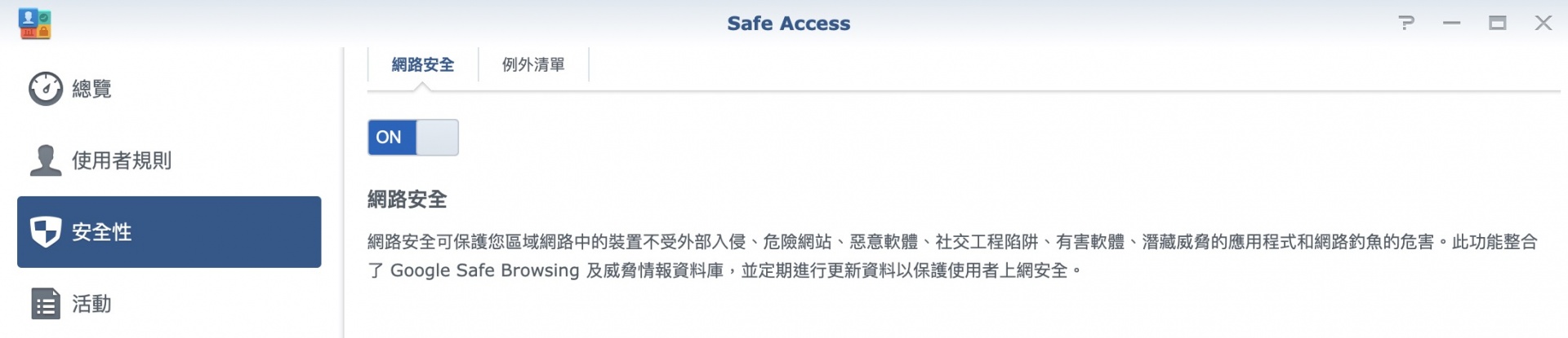 ▼ 首先最基本的,就是打開安全性的網路安全,他會比對 Google 資料庫的數十億個網址,防止家中成員不小心誤上一些惡意網站。