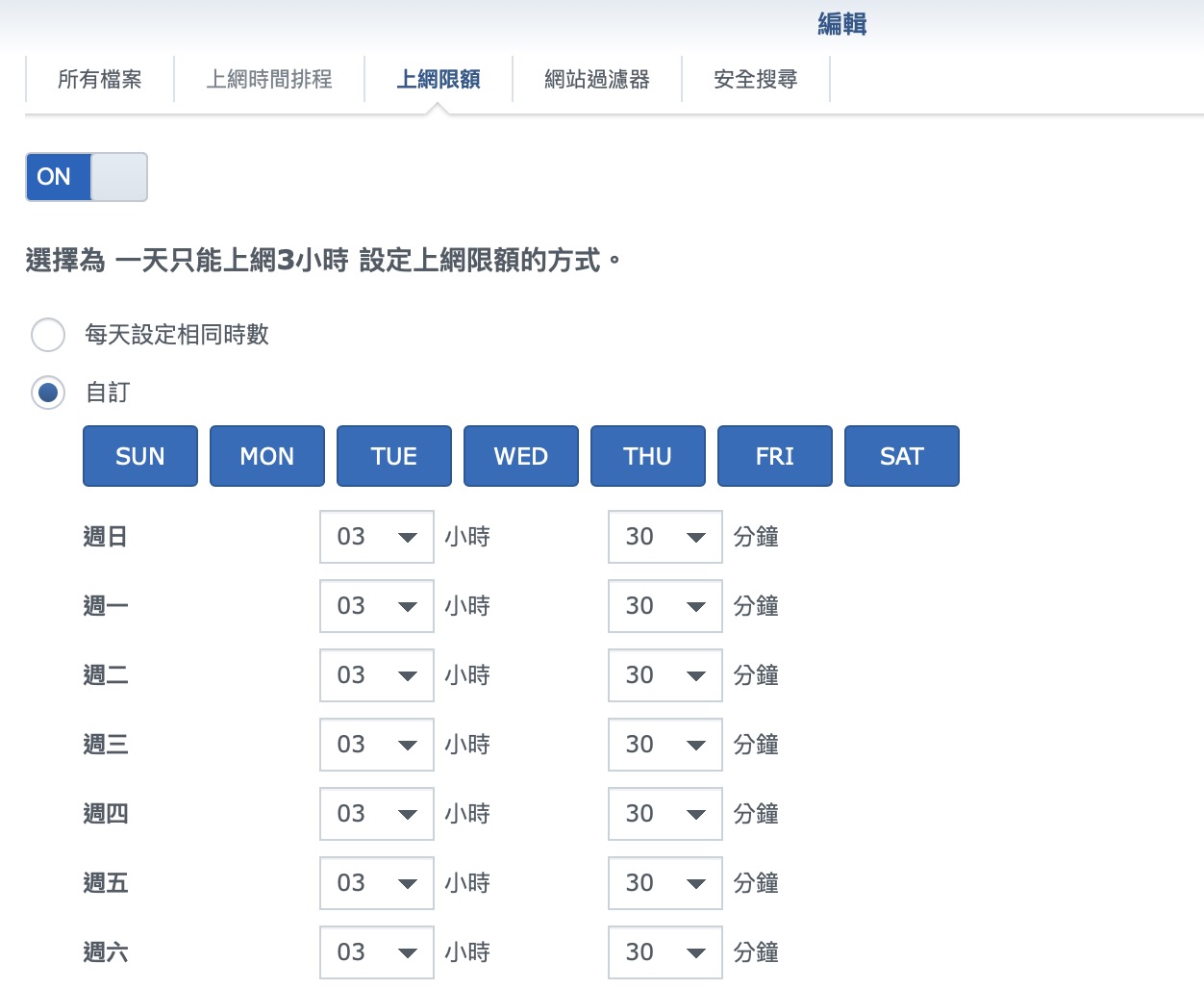 ▼ 在上網的時數方面,可以有兩種的方式,一種是總額度的限制,讓他一天只能上網固定時間,由他自己分配。