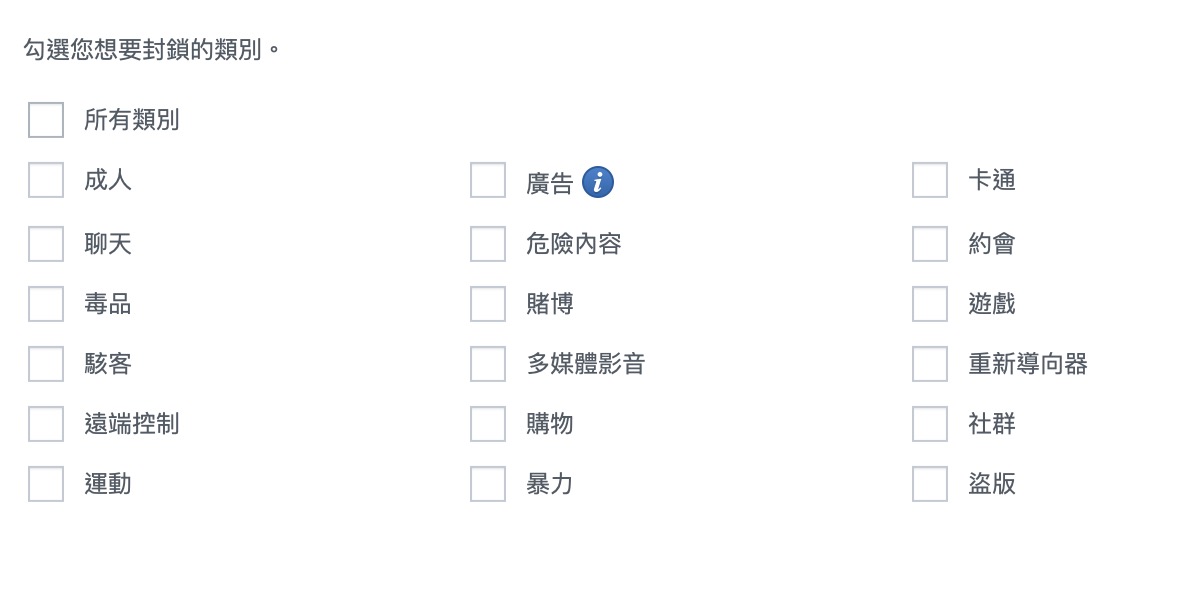 ▼ 或是我老婆整天逛網拍,我也懶得每個網拍都設定,就可以直接在類別這邊封鎖購物的類別。