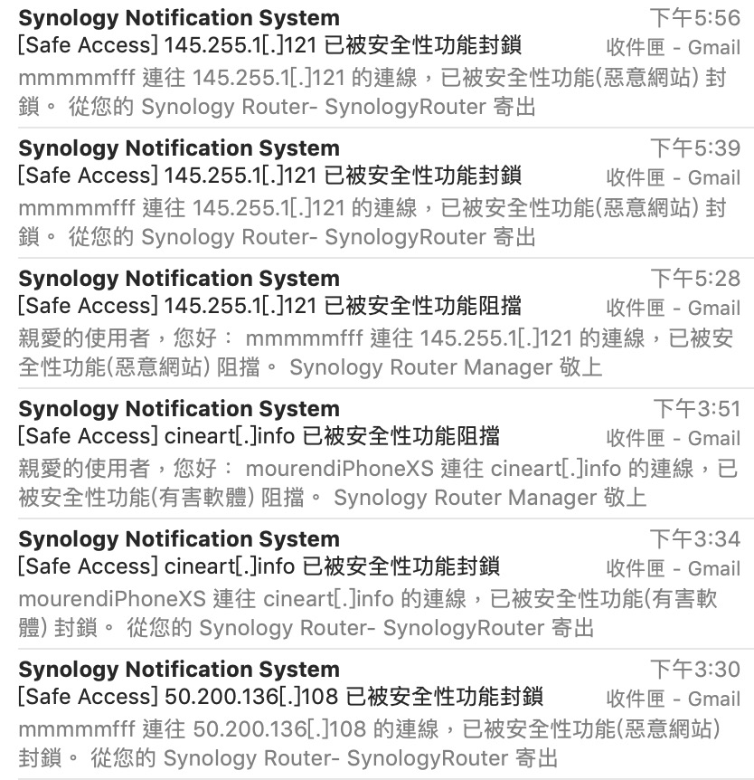 不過其實這裡我覺得很怪,因為有些信件是我在使用電腦的時候收到的,但當時我並沒有上一些惡意網站,甚至也沒有開啟新的網頁,就是既有的網頁繼續瀏覽,但一樣的網頁,偶爾在重新整理頁面的時候也收到通知說封鎖了 xxx ip 網站。