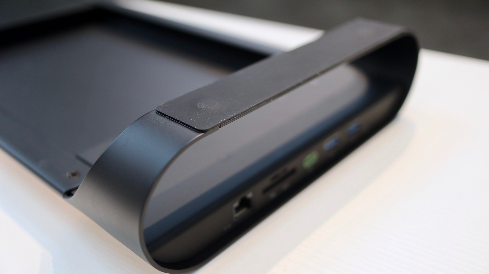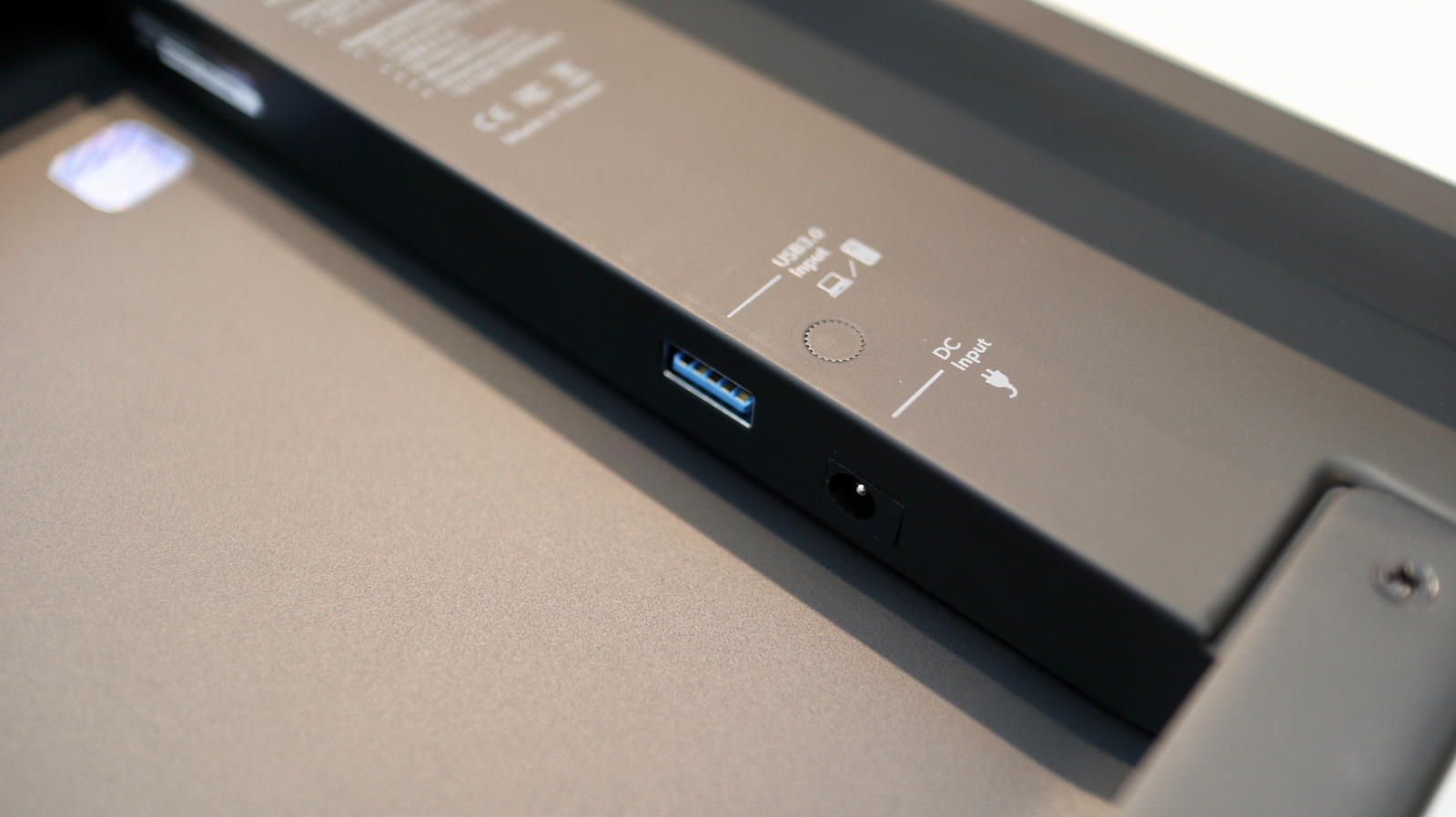 ▼ 把它翻過來,看看內側就可以看到了,這裡有一個主要的連接孔,就是用來連接你的電腦,無論你是 Mac 還是 PC 都可以。然後插上專屬的變壓器。