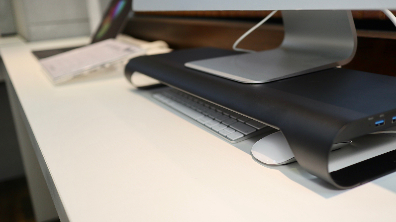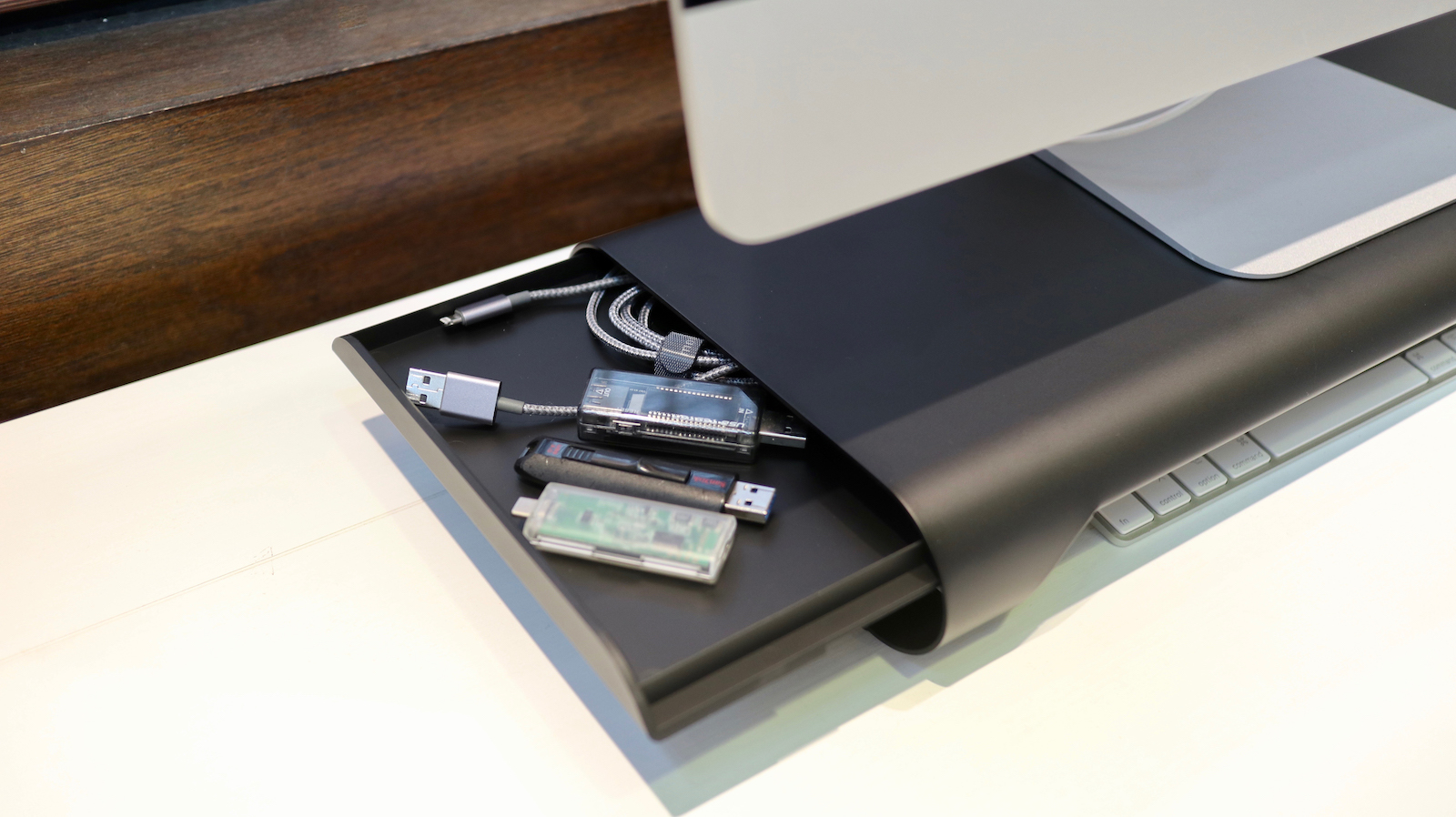 ▼ 他本身可以負重 15 公斤,即便是 iMac 27″ 也不過 9.5 公斤,所以旁邊都可以放你的小東西比如手機,是絕對沒問題的,甚至買幾本書都可以,空間或是負重都不是問題。