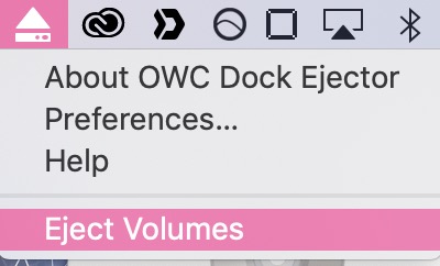 ▼ 之後只要在選單列上按下 Eject Volumes,就可以通通退出了。不過只有透過 OWC 連接的才會喔,其他的裝置不會受到這個影響。